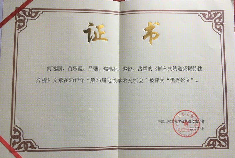 在会议颁奖仪式上,大会对城市轨道交通创新工程奖、创新技术奖和学术交流优秀论文奖进行了现场颁奖。经过大会评选,由新筑股份组织报送的论文《嵌入式轨道减振特性分析》荣获优秀论文奖,成功入选《2017中国城市轨道交通关键技术论坛论文集》,并接受了现场颁奖。