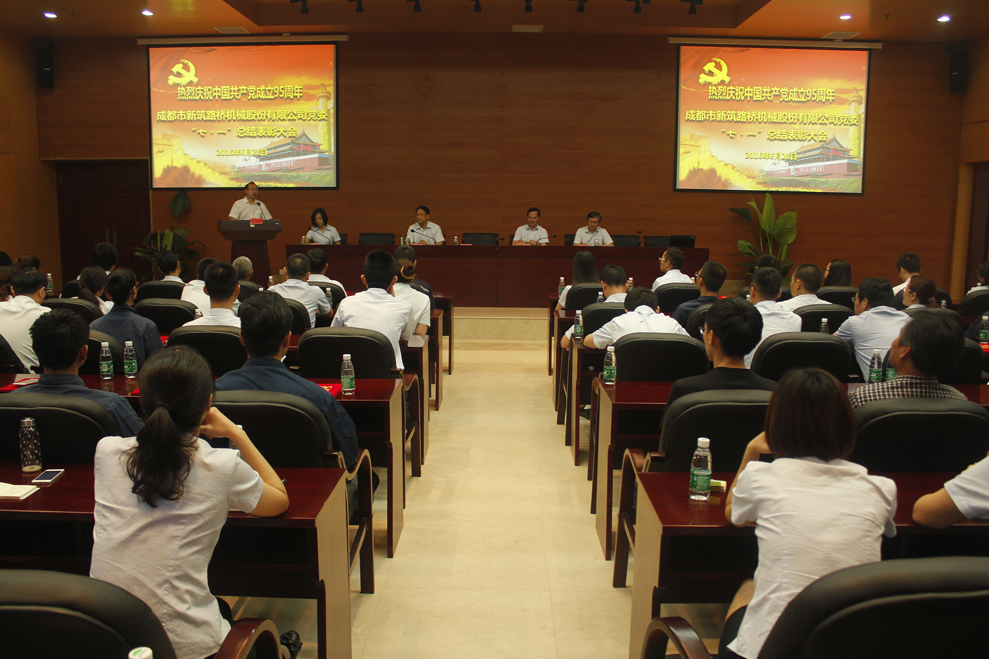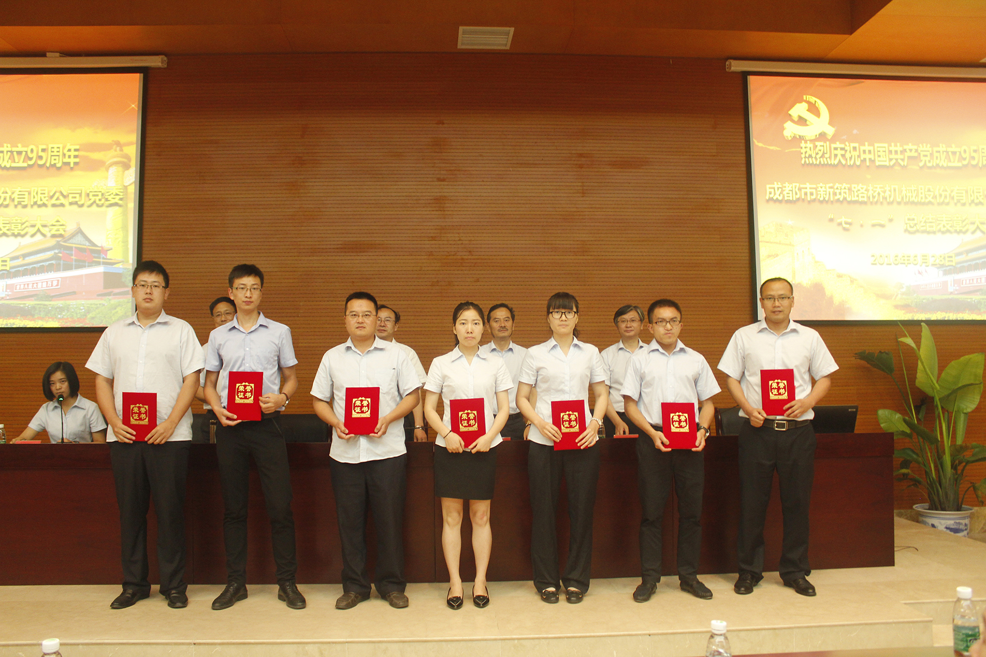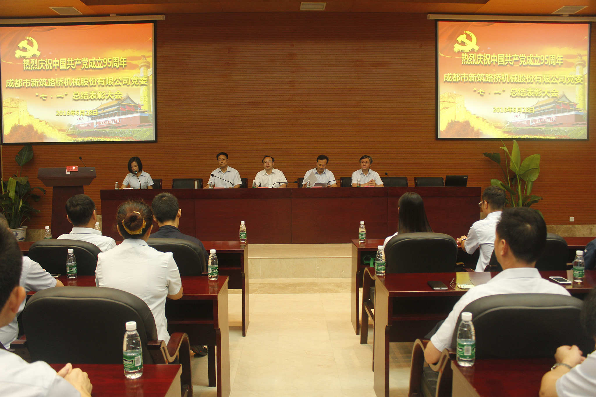 2016年6月28日上午9:00,新筑股份公司党委在公司223会议室召开了庆祝建党95周年总结表彰大会,新津县“两新”党工委副书记刘仁斌、公司董事长黄志明、公司党委书记、副总裁王斌、公司党委委员、党支部书记、优秀党员以及各支部党员代表共计100余人参会。